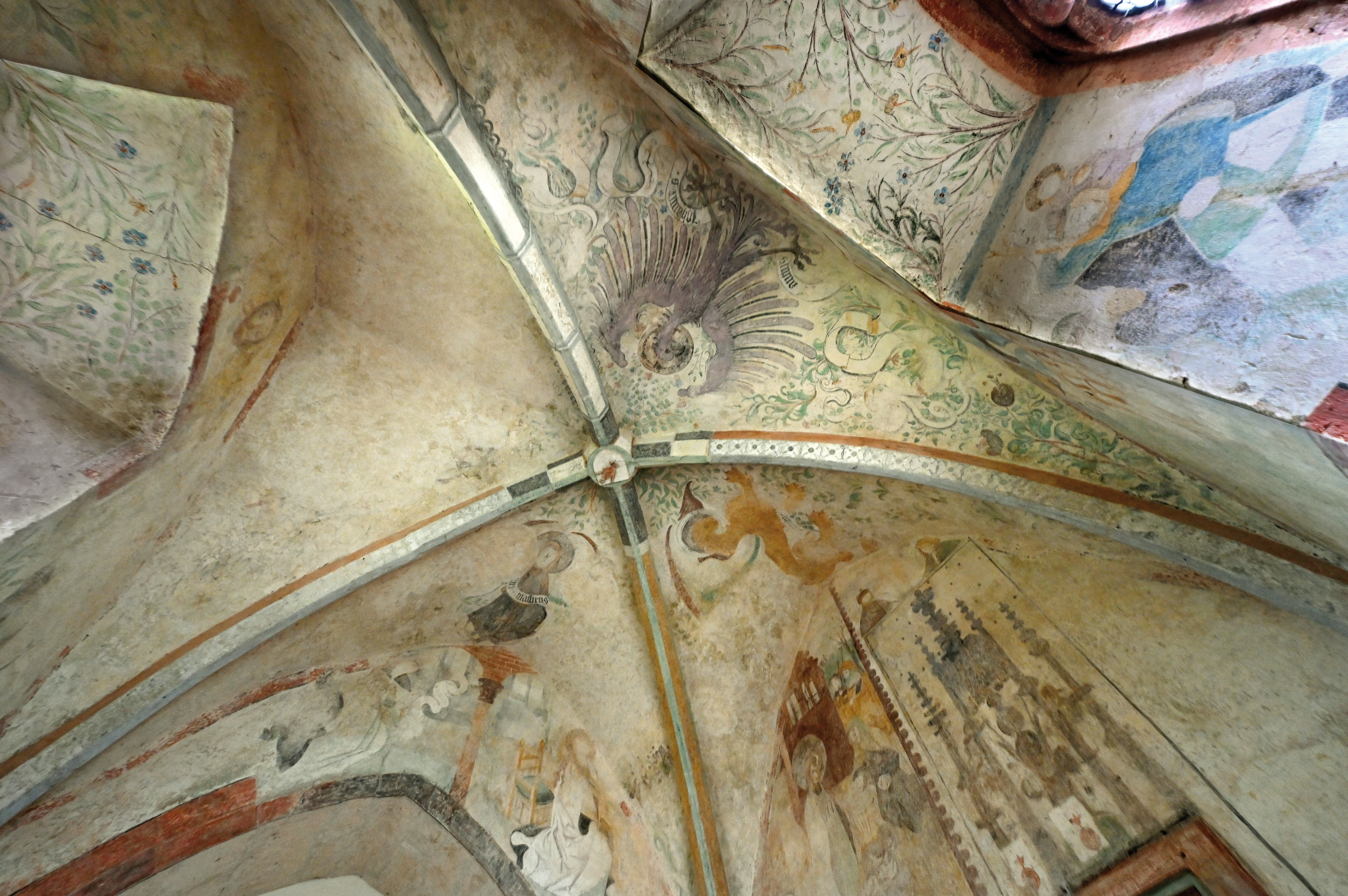 In 1774, the medieval village church of Kleinfischlingen was given a new nave and a baroque tower. The substructure with the square, cross-ribbed vaulted choir room has been preserved from the tower built in 1400. In 1968-1973, extensive remains of the fresco paintings were uncovered, which had been whitewashed over during the Reformation. Impressive depictions of biblical scenes can be seen in the wall and ceiling paintings, which were created around 1500: The four evangelists with their symbols, blessed persons under the protective mantle of Mary, the birth of Christ, the Last Judgement with Jesus as world judge on the rainbow. Among the saints depicted, St. Christopher stands out as the patron saint of pilgrims and travelers: he is leaning on his staff with branches sprouting from its tip. In the Middle Ages, it was believed that looking at St. Christopher in the face of death would lead the soul directly to paradise without the judgment of the world. The vault keystone shows a slanted red jug, which can be interpreted as a reference to a blessing.