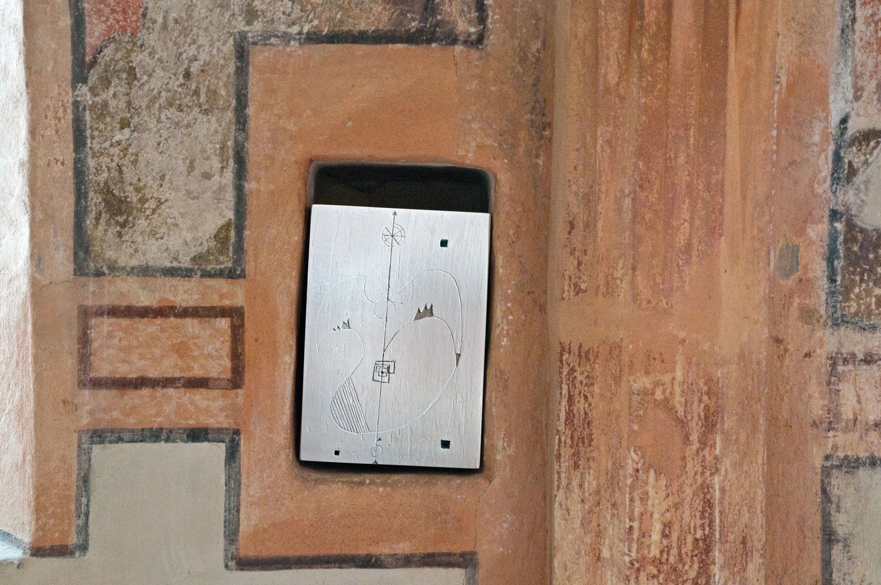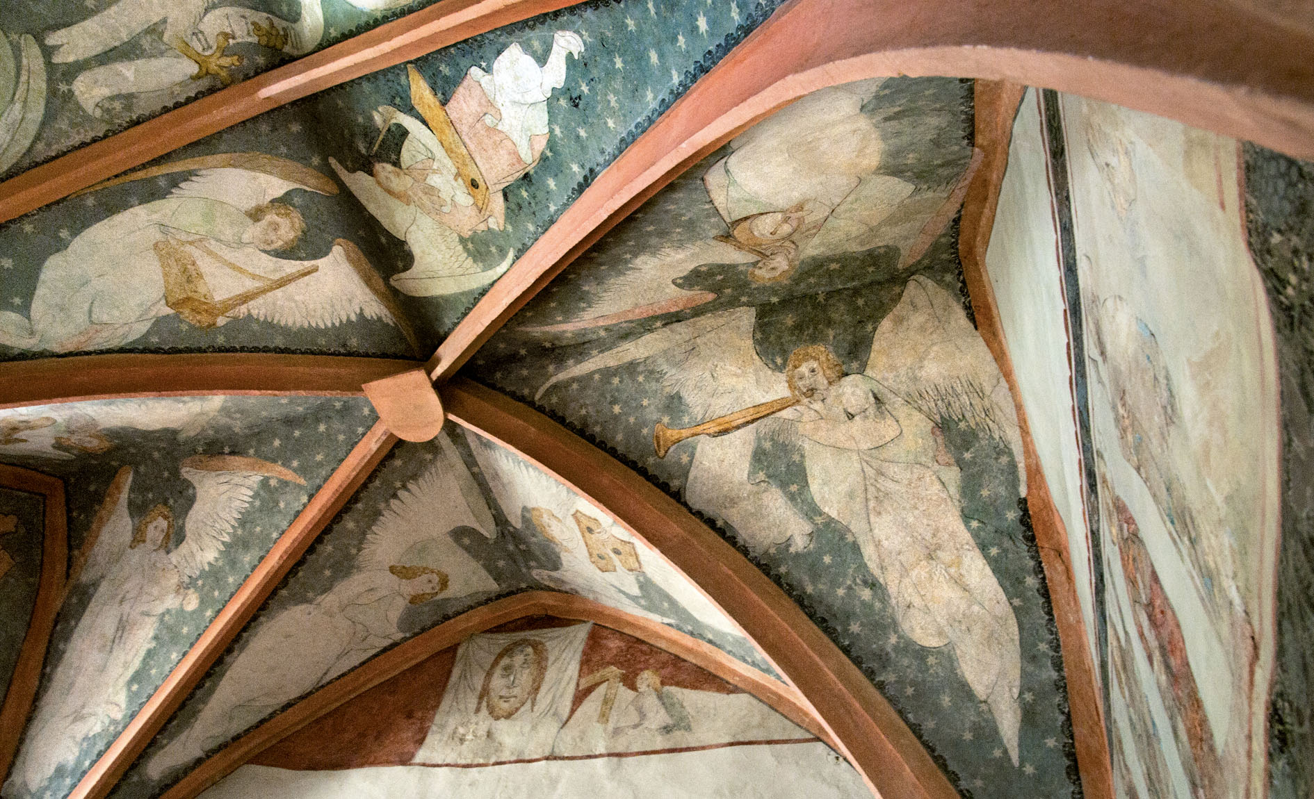 Peintures au plafond (vers 1500), tour ouest (datée de 1503). L’image mentale interprète de manière contemporaine les fresques de la voûte du chœur de l’église, dans laquelle sont notamment représentés des anges musiciens. Le 15e siècle est considéré comme le siècle des anges. Dans la liturgie de l’époque, on pensait que pendant la consécration, les anges jouaient le « Sanctus » depuis le ciel étoilé. Comme cette musique céleste n’était pas audible pour les hommes de la terre, elle devait être perçue sensoriellement dans la méditation de la prière. Cette invitation à s’arrêter est toujours valable aujourd’hui.